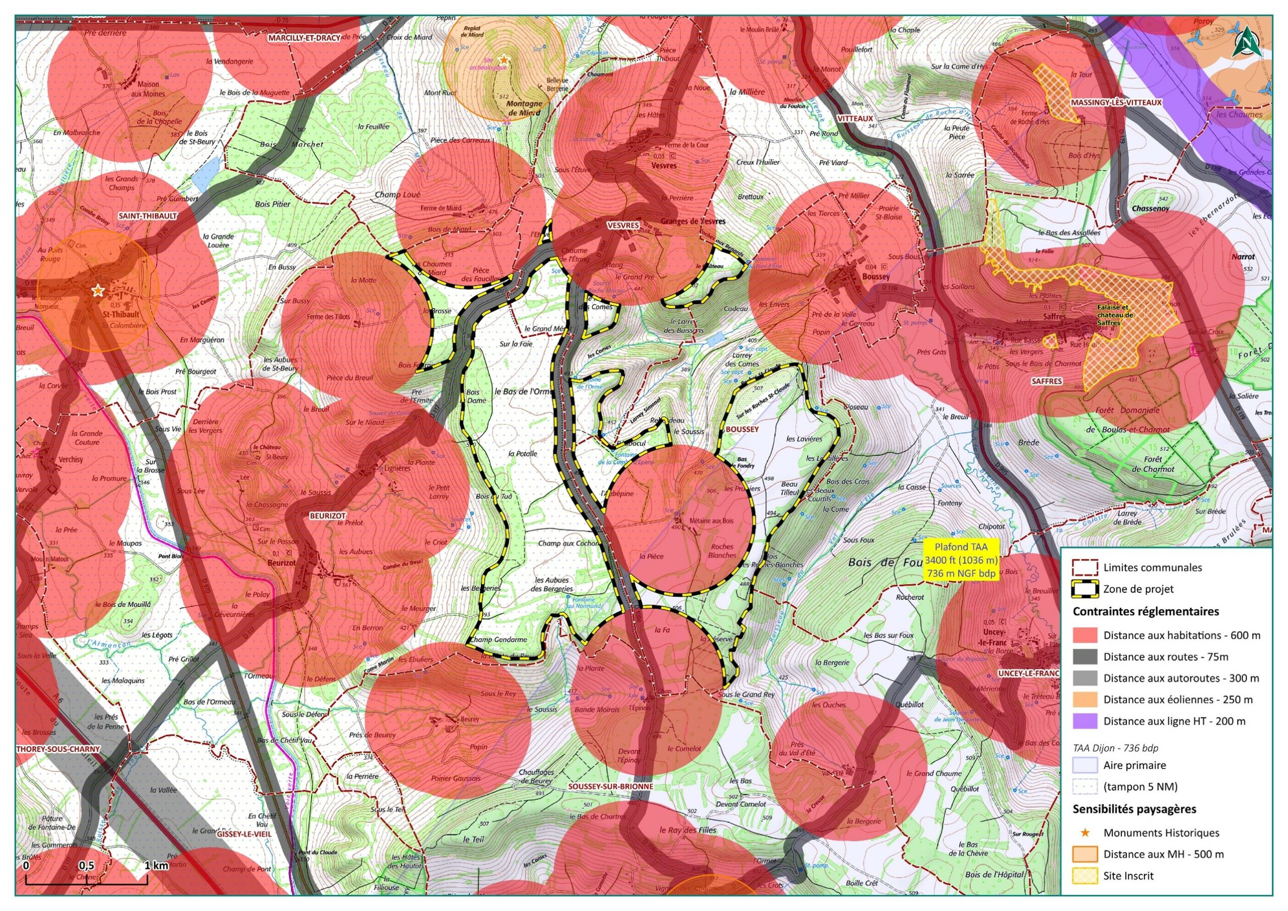 La réglementation impose un éloignement de 500 mètres des habitations, définissant ainsi une zone d’étude. Nous avons choisi d’élargir celui-ci à 600 mètres des habitations afin qu’il y ait le plus faible impact possible. Les études environnementales, paysagères et acoustiques réalisées depuis plus d’un an ont permis de conclure à la faisabilité d’un projet éolien sur la zone.